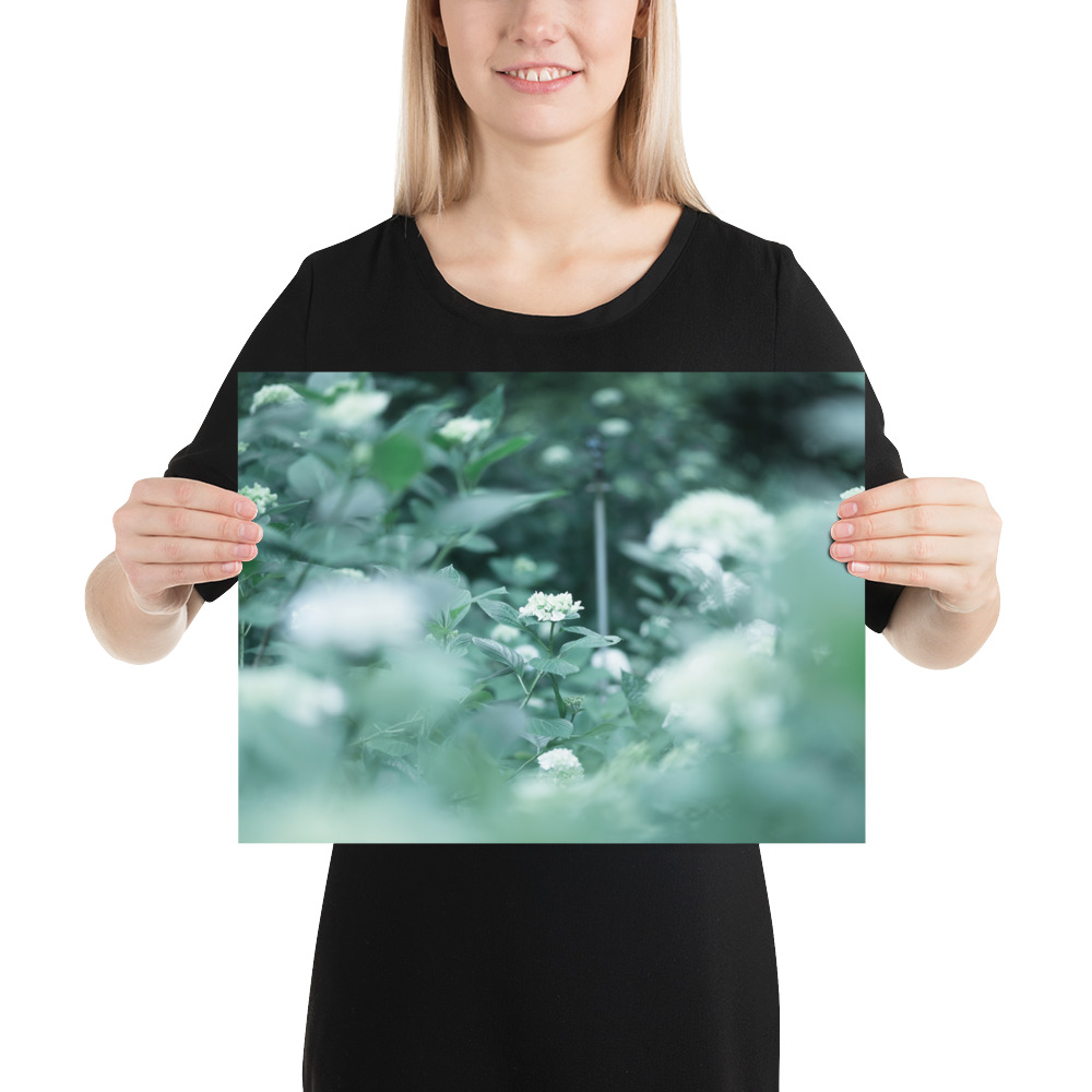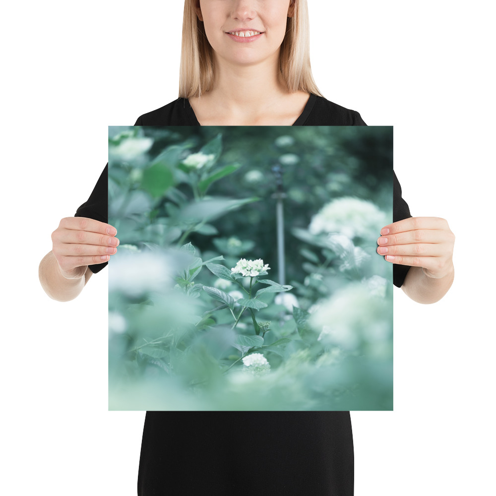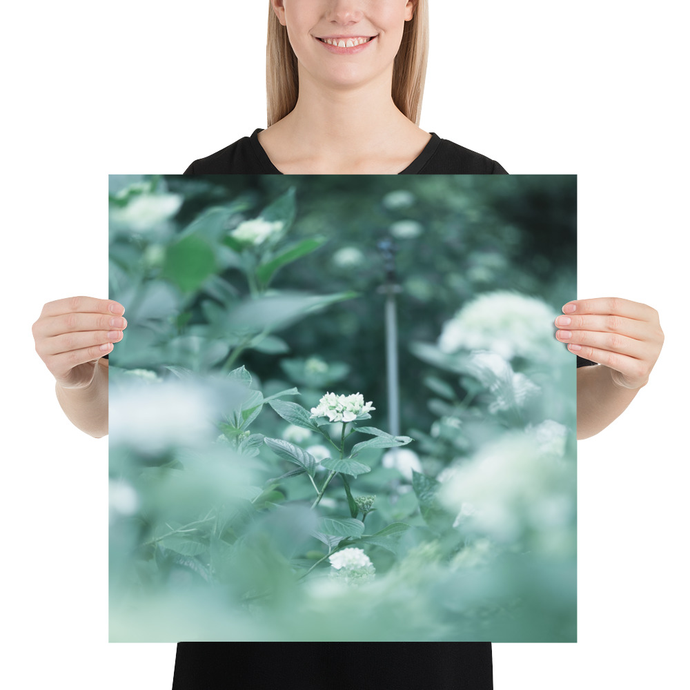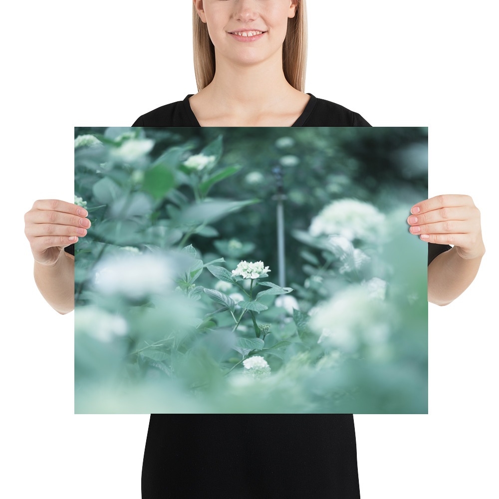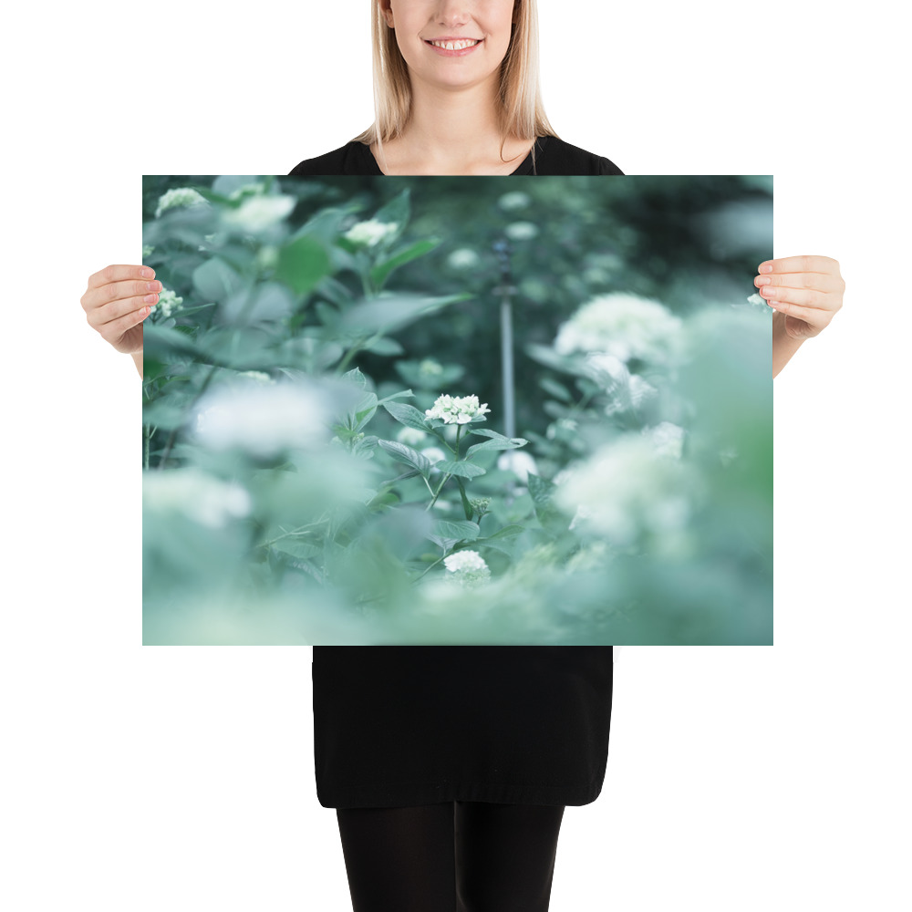 This fine art poster features a delicate hydrangea captured in a soft, ethereal palette of misty greens and pale blues. The gentle bokeh and natural composition evoke the quiet serenity of a morning garden, bringing a touch of botanical elegance to any modern or minimalist interior.