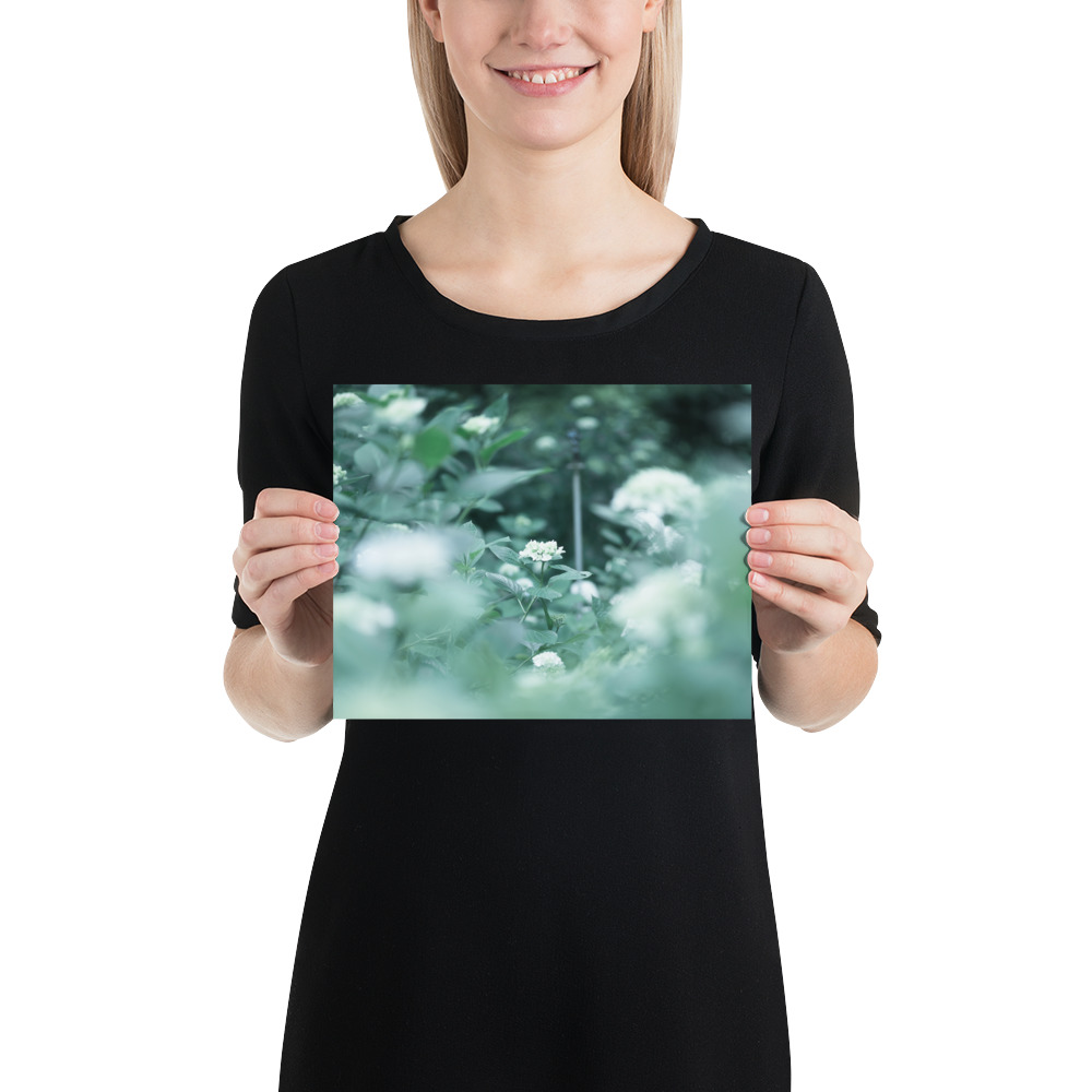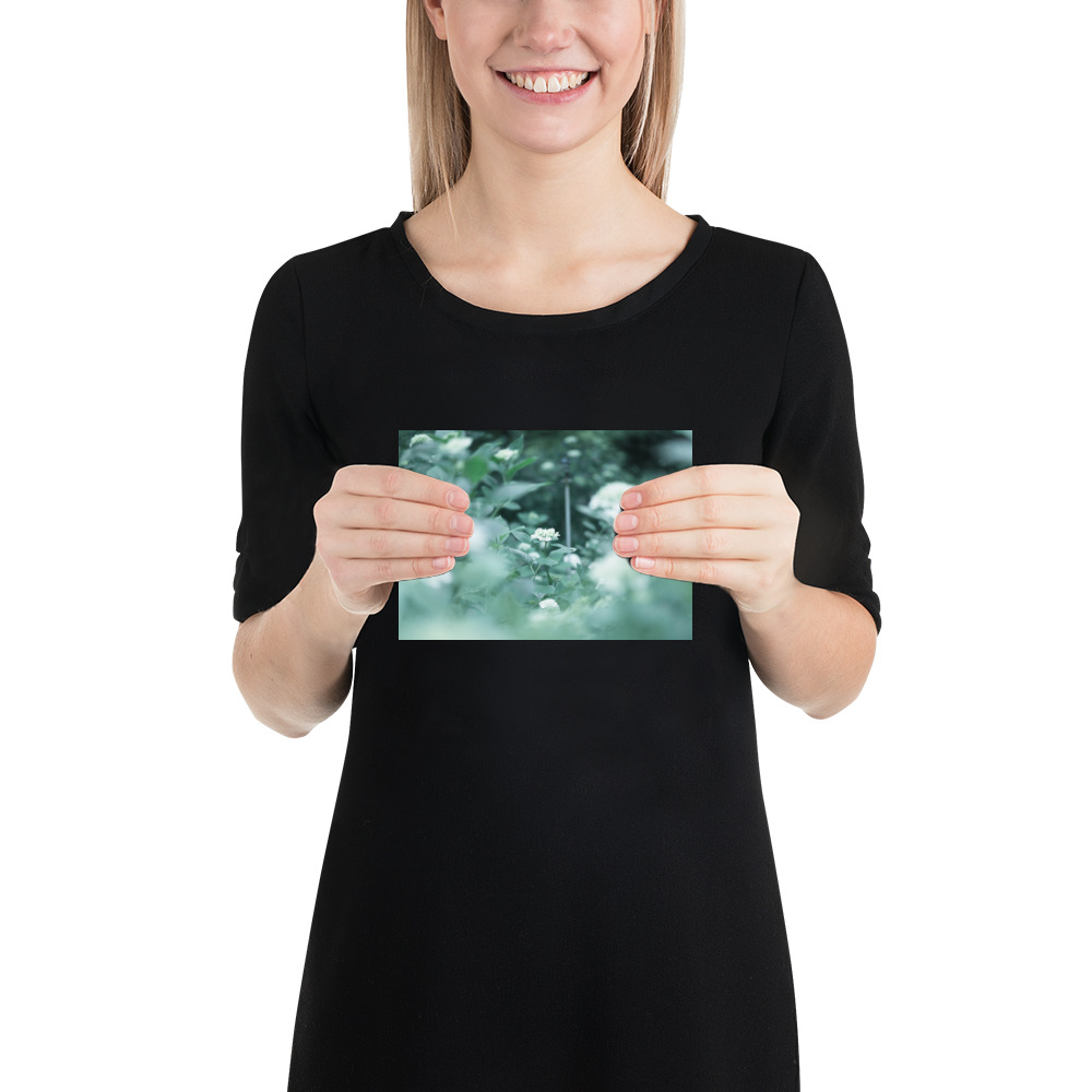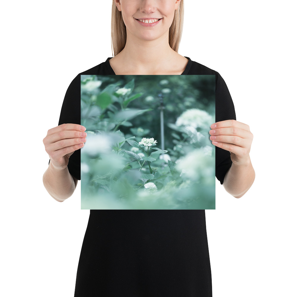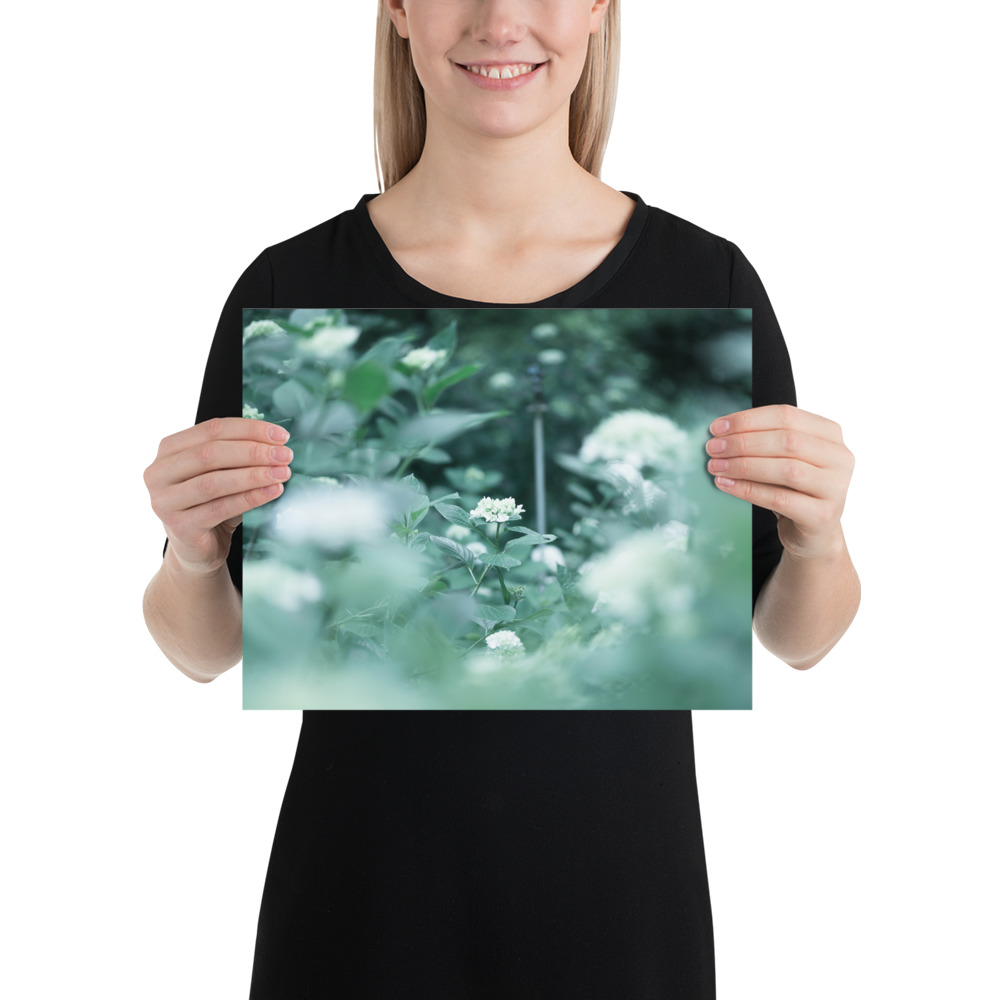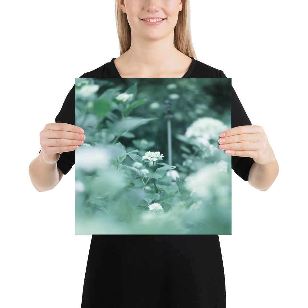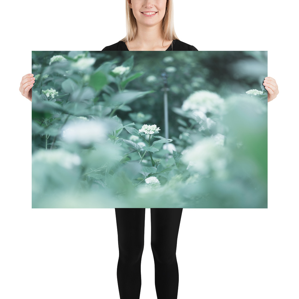 This fine art poster features a delicate hydrangea captured in a soft, ethereal palette of misty greens and pale blues. The gentle bokeh and natural composition evoke the quiet serenity of a morning garden, bringing a touch of botanical elegance to any modern or minimalist interior.